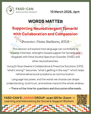 FASD-CAN run quarterly webinars for the support sector featuring special-interest presentations from FASD-informed experts. The aim is for our support professionals to learn more about this specific neurodisability and gain strategies to help them (and their whānau / families) to live their best lives.