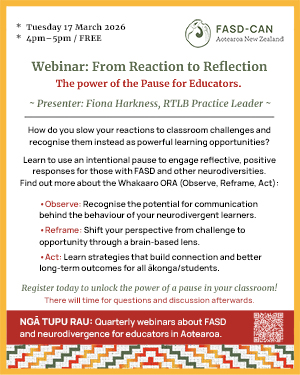 Supporting ākonga/students with Fetal Alcohol Spectrum Disorder (FASD) requires understanding, empathy, and effective strategies. Join us for an interactive, one-hour webinar designed to equip educators with a practical framework for moving beyond immediate reactions to thoughtful, reflective, best-practice responses.